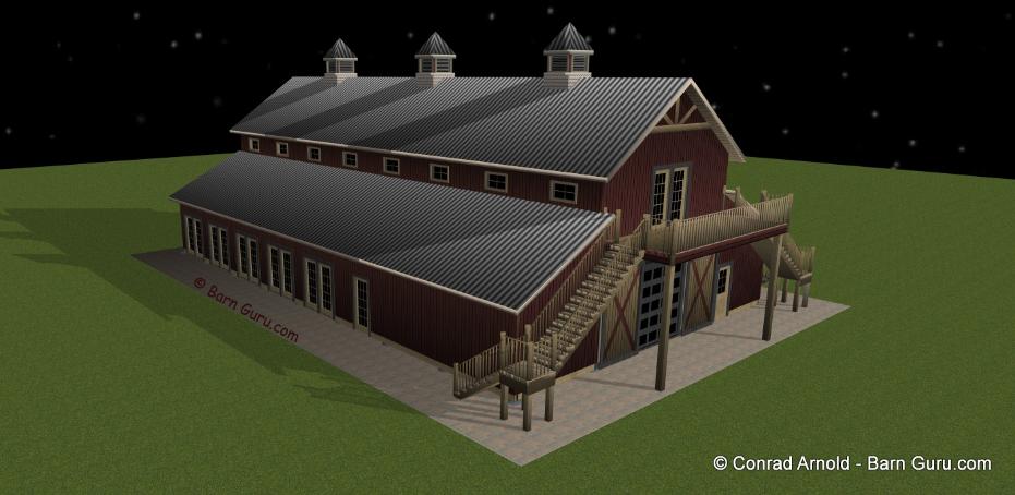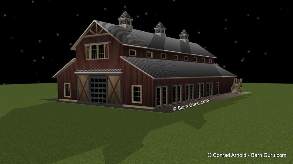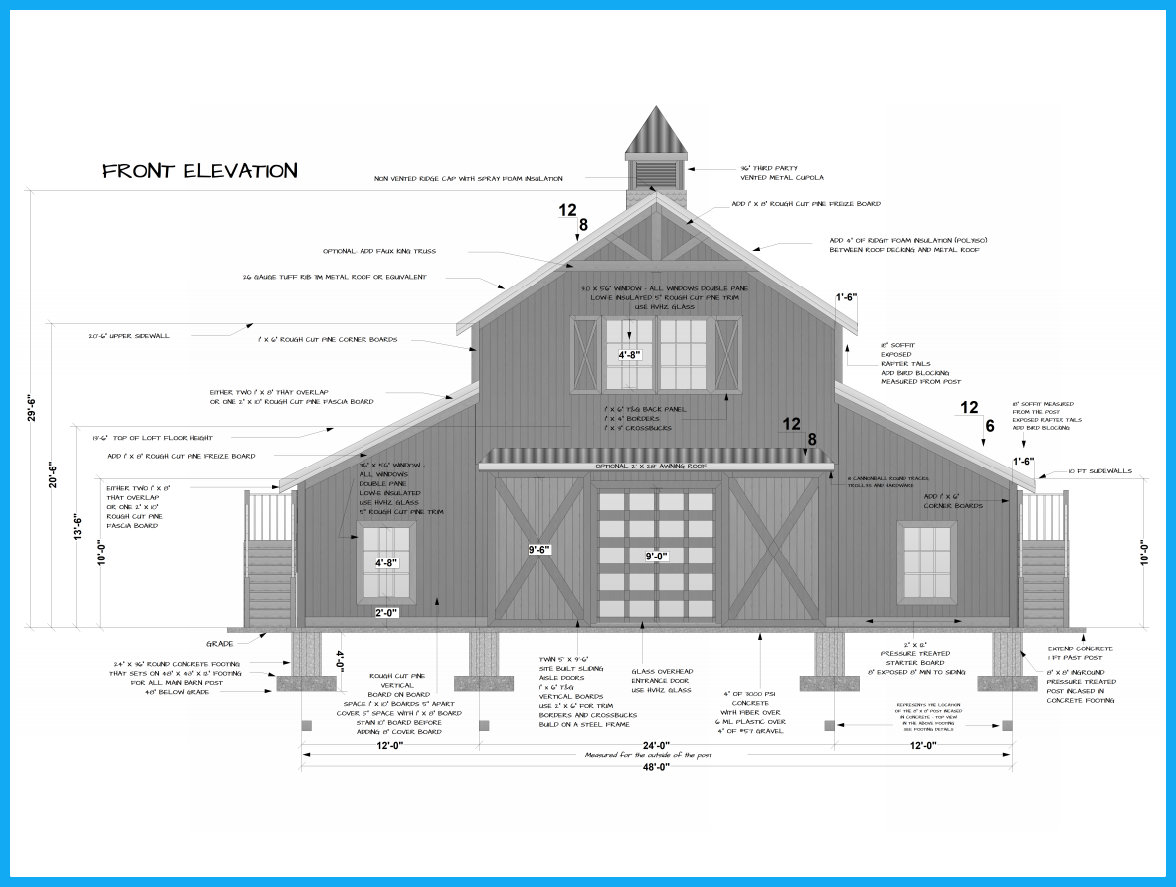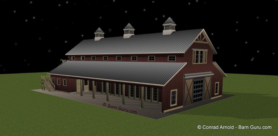 | Buy The Floor Plan, Footing layout, Footing Details and Elevations for $600.00. If you are planning to build the barn yourself or if your builder is unfamiliar with horse barn construction you may need framing details and a materials list . Most experienced builders would only need the above floor plan and elevations and could give you several framing option. Our framing details would be the way we would frame the barn using 8" x 8" post with double rafters that sandwich post 10' o.c., with 4" x 6" purlins 32" o.c., or you can choose typical roof framing with rafters 16" o.c. Either framing techniques will show detailed site built king trusses 10' o.c. You can always order the framing details and a material list later if you need them. Add $600.00 for framing details if you need them. Add $400.00 if you need a material list with Georgia material pricing. Add $200.00 to Modify the plan |