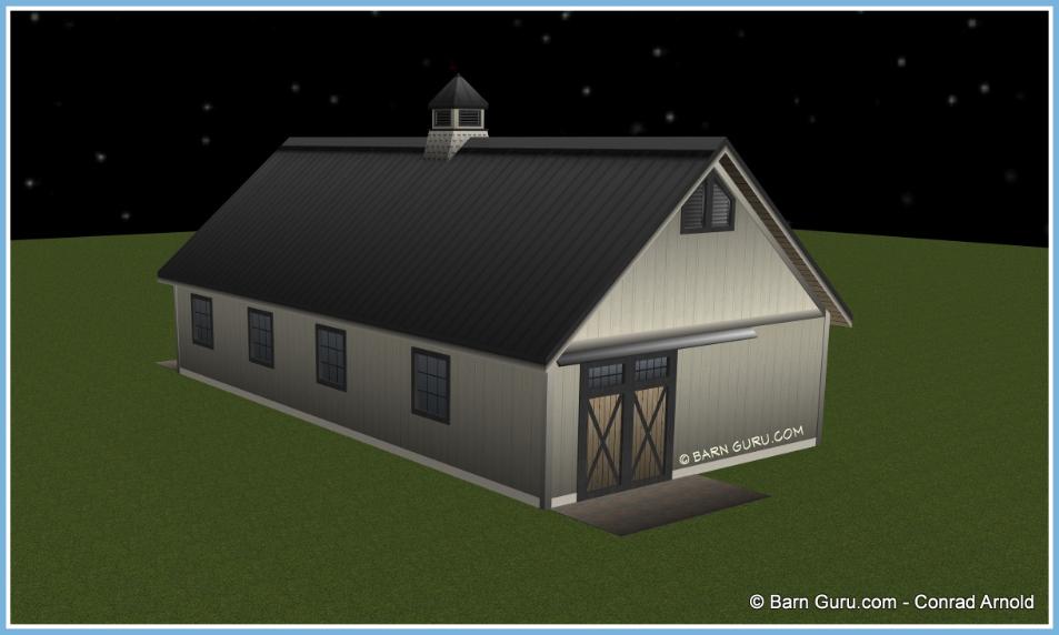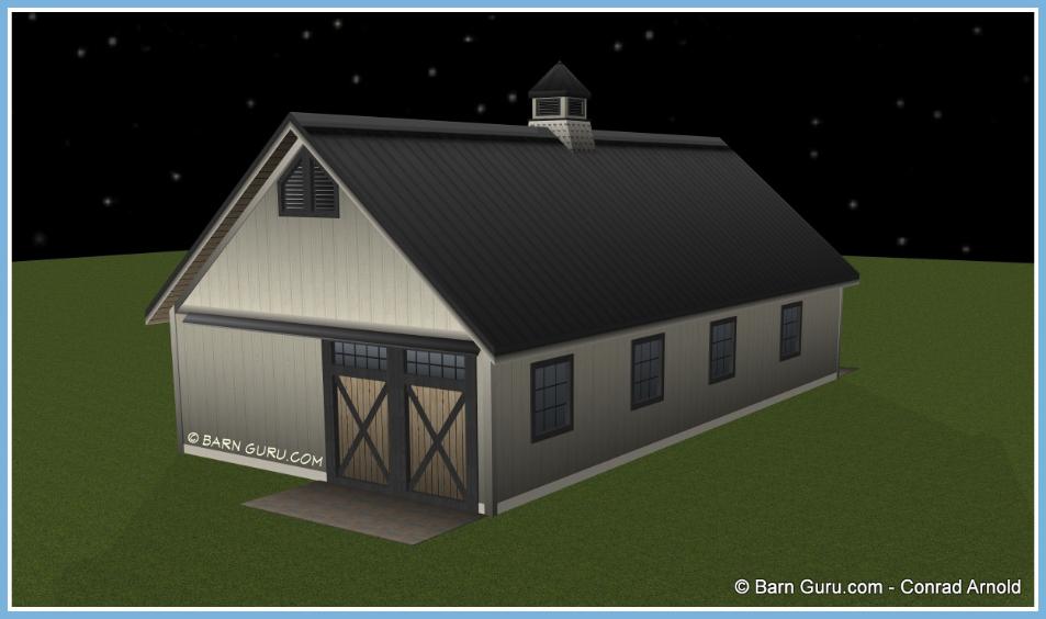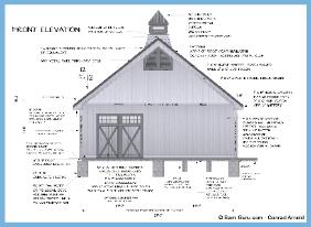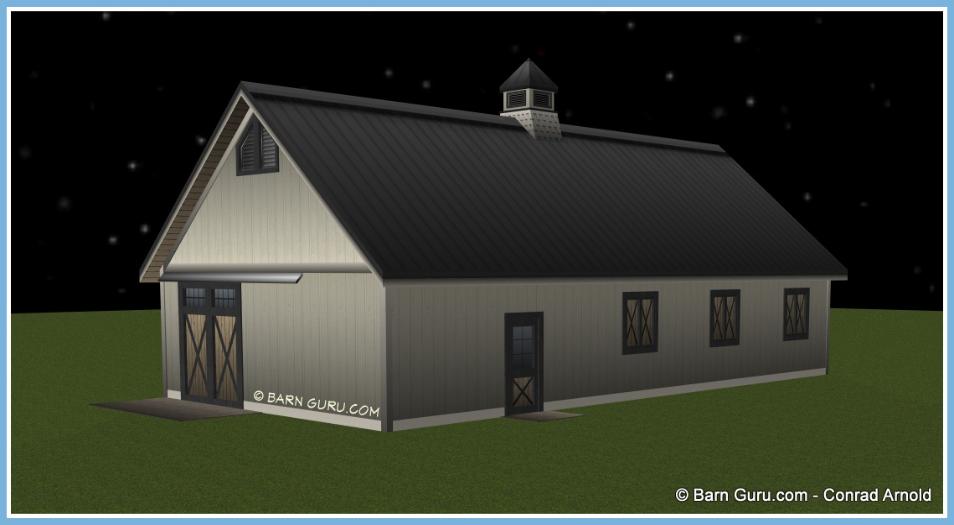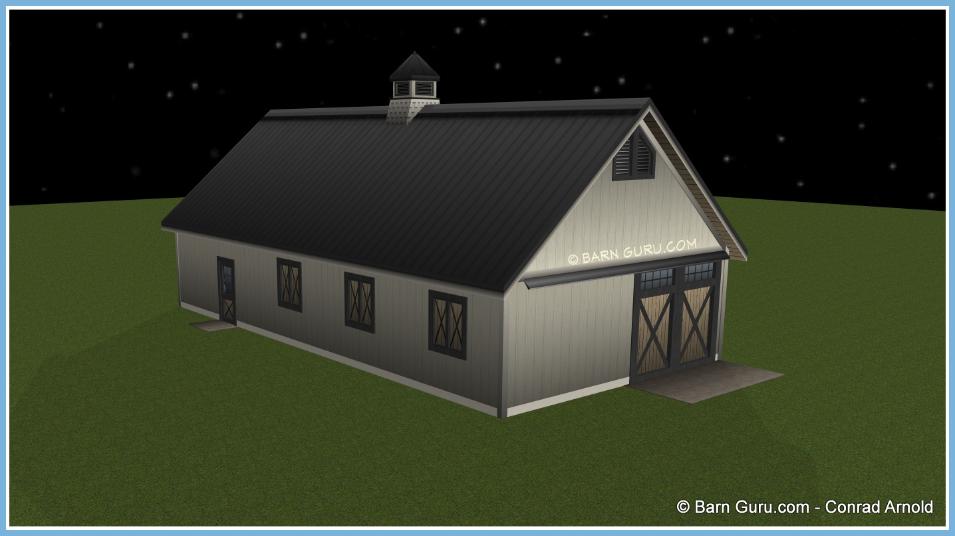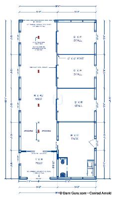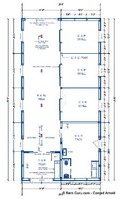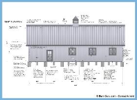 If you are planning to build the barn yourself or if your builder is unfamiliar with horse barn construction you may need framing details and a materials list . Most experienced builders would only need the above floor plan and elevations and could give you several framing option. Our framing details would be the way we would frame the barn using 6" x 6" post with double rafters that sandwich post 12' o.c., with 4" x 6" purlins 24" o.c., or you can choose typical roof framing with rafters 16" o.c. Either framing techniques will show detailed site built king trusses 12' o.c. You can always order the framing details and a material list later if you need them.